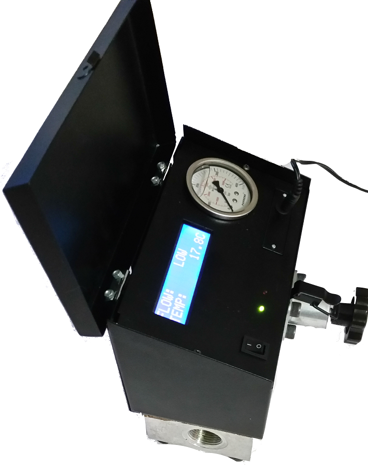 Kısakürek Flowmetre alüminyum blok, dijital gösterge, manometre ve yükleme valfinden oluşur